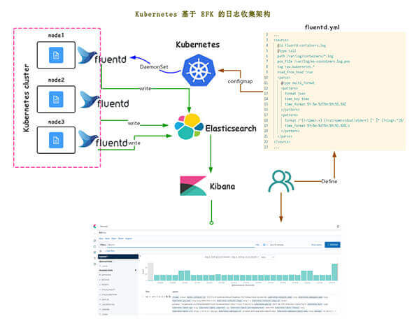 EFK 是 Elasticsearch、Fluentd、Kibana 三個(gè)開(kāi)源軟件的首字母縮寫(xiě),它是業(yè)界主流的容器時(shí)代日志收集處理的最佳解決方案。Fluentd 是一個(gè)日志收集器,負(fù)責(zé)從各個(gè)服務(wù)器節(jié)點(diǎn)抓取日志。Elasticsearch 是一個(gè)搜索存儲(chǔ)引擎,可以存儲(chǔ) Fluentd 收集的日志,并提供查詢(xún)服務(wù)。Kibana 是 Elasticsearch 的一個(gè)界面化組件,提供 UI 方式查詢(xún) Elasticsearch 存儲(chǔ)的數(shù)據(jù)。它們之間數(shù)據(jù)流是:Log 源> Fluentd 收集 > Elasticsearch > Kibana UI